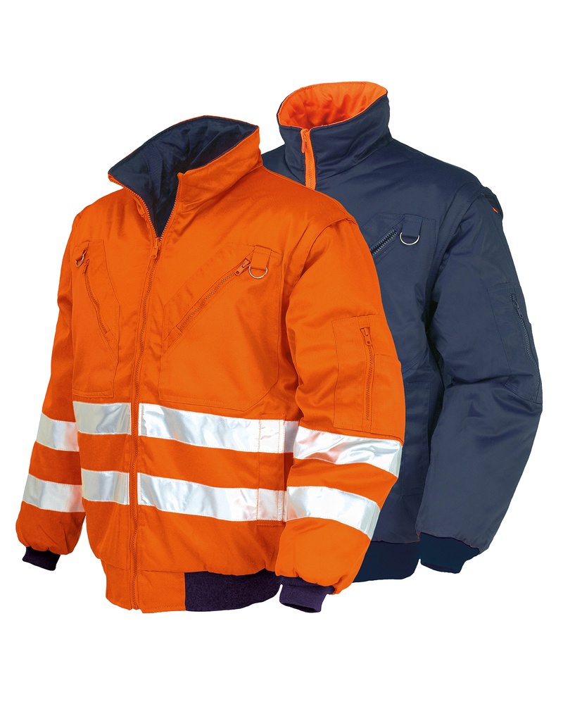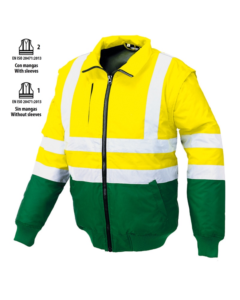 (Colors 038 AV yellow/green, 048 AV yellow/blue) EN ISO 13688:2013 EN ISO 20471:2013 + A1:2016 CLASS 2 sleeved, CLASS 1 sleeveless Pilot in two-tone AV fabric with detachable sleeves and several internal and external pockets. Composition: polyester oxford coated with PU. Sizes: XS-S-M-L-XL-XXL-3XL. Colors: AV yellow/green, AV yellow/blue. Packaging: 10 pcs.