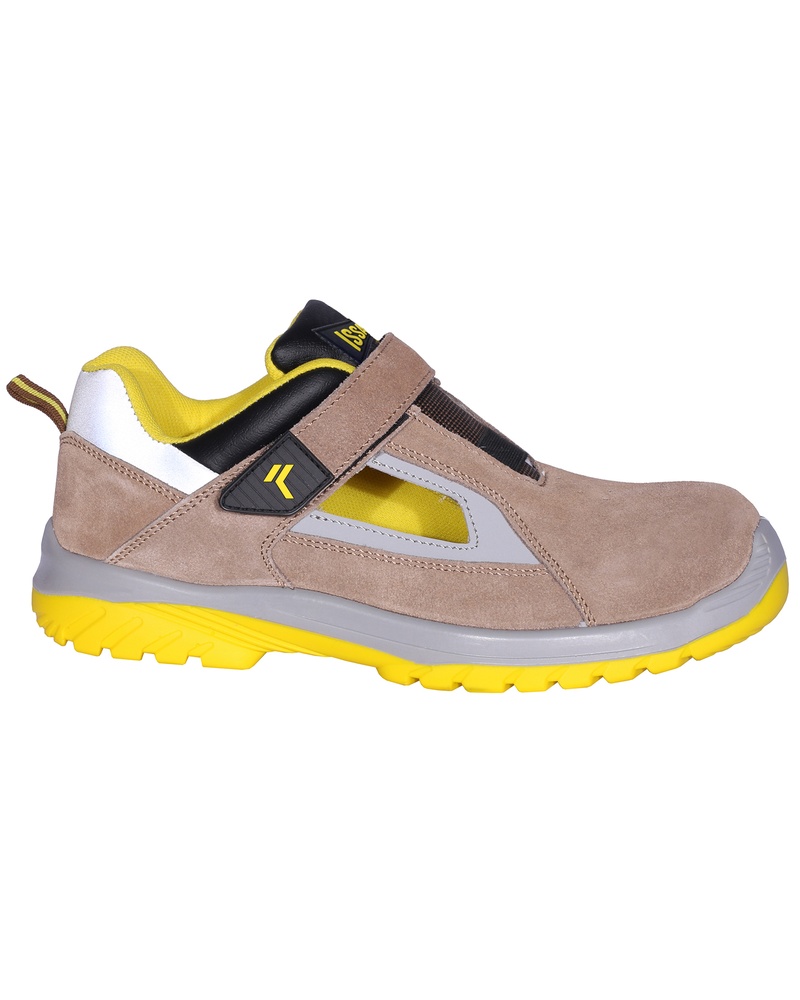 EN ISO 20345 S1P SRC Sandália de couro com sola de PU bidensidade antiderrapante e fecho de velcro. Aberturas laterais para melhorar a respirabilidade do pé. Cor: bege/amarelo Biqueira: fibra de vidro. Laminado: têxtil. Tamanhos: 36 a 48. Embalagem: 5 pares. Outras caraterísticas: Sem metal